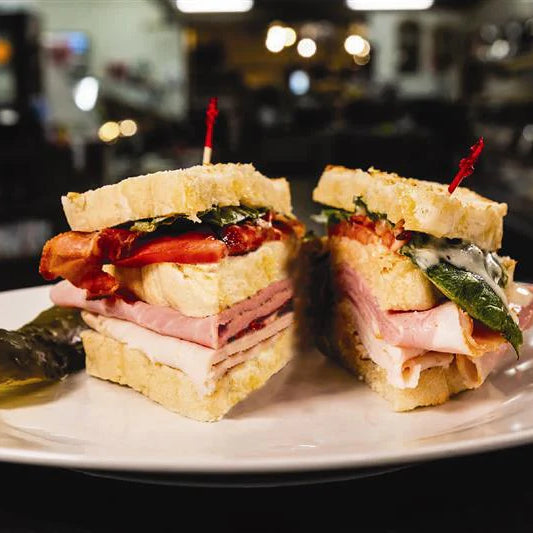 Grab a bite to satisfy your hunger with this deliciously loaded sandwich! Generous portions of ham, turkey and bacon with tomato, lettuce and chedd...